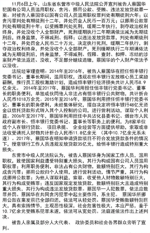 近日,恒豐銀行原董事長(zhǎng)蔡國(guó)華犯國(guó)有公司人員濫用職權(quán)、貪污、挪用公款、受賄、違法發(fā)放貸款罪一案一審公開(kāi)宣判。